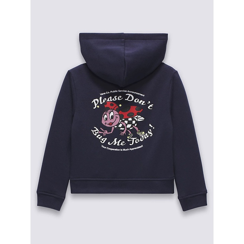 The Little Kids Don’t Bug Me Zip Hoodie is a zip front hoodie with a slimmer fit. It also features ribbed details with a screenprinted graphic of a Vans logo sitting on a ladybug on the front, and a larger graphic of the same with a ”don’t bug me” message on the back.
